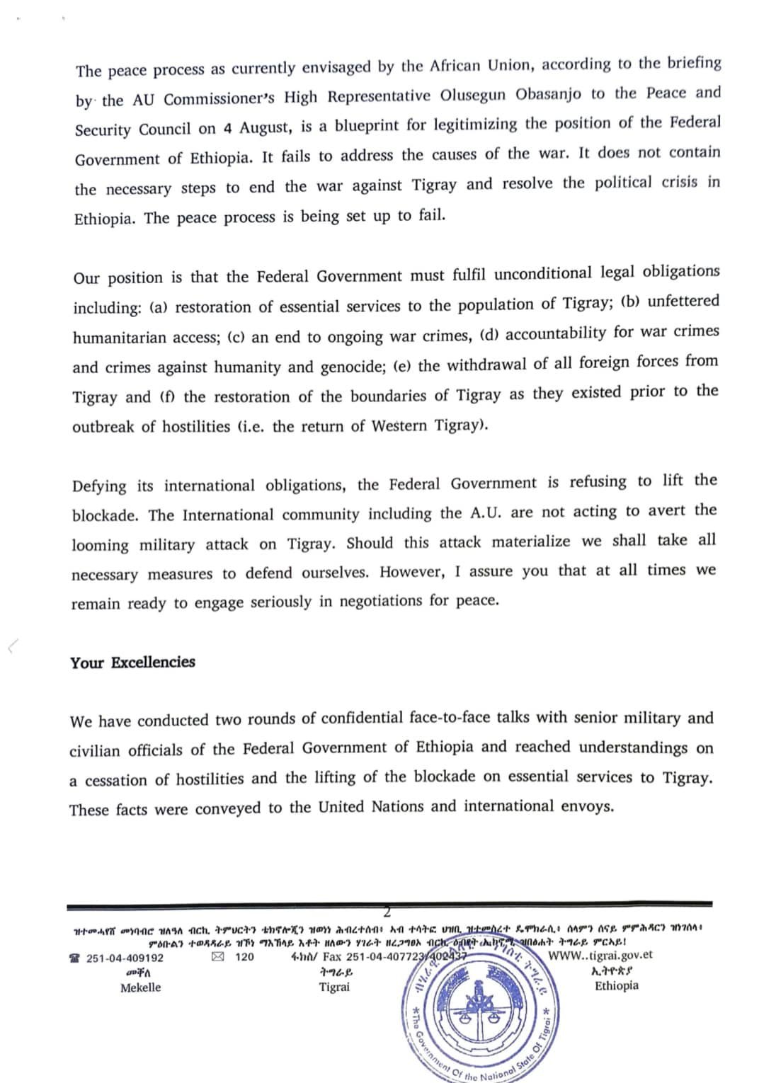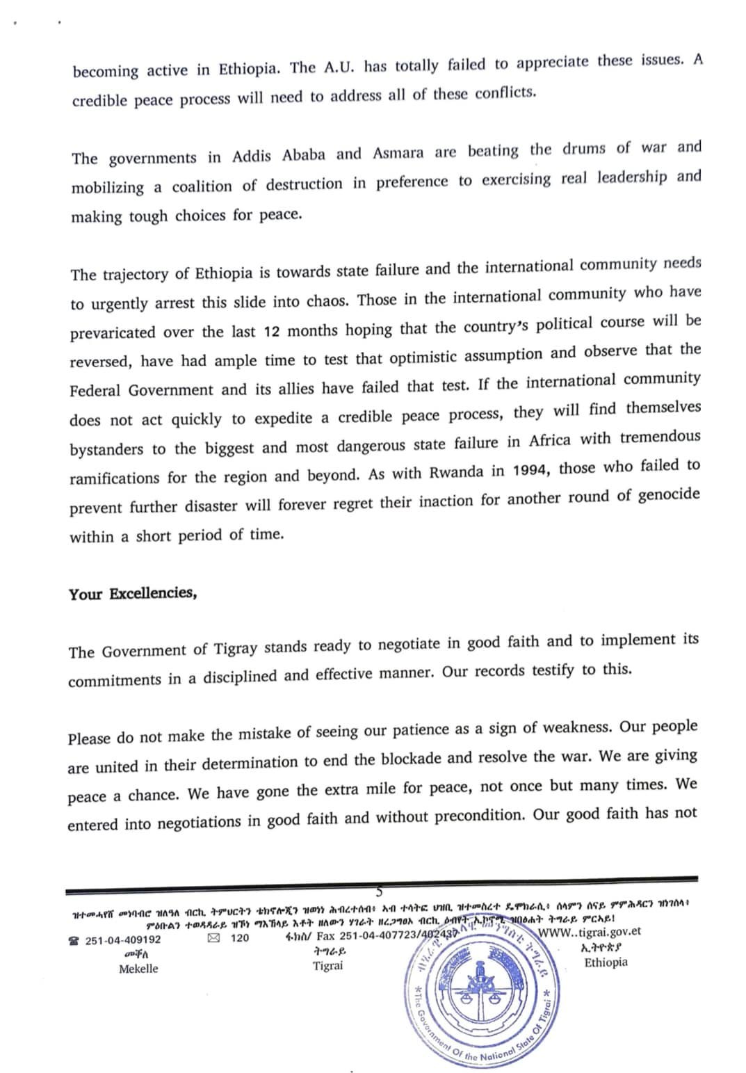 Open letter from the President of the Government of Tigray