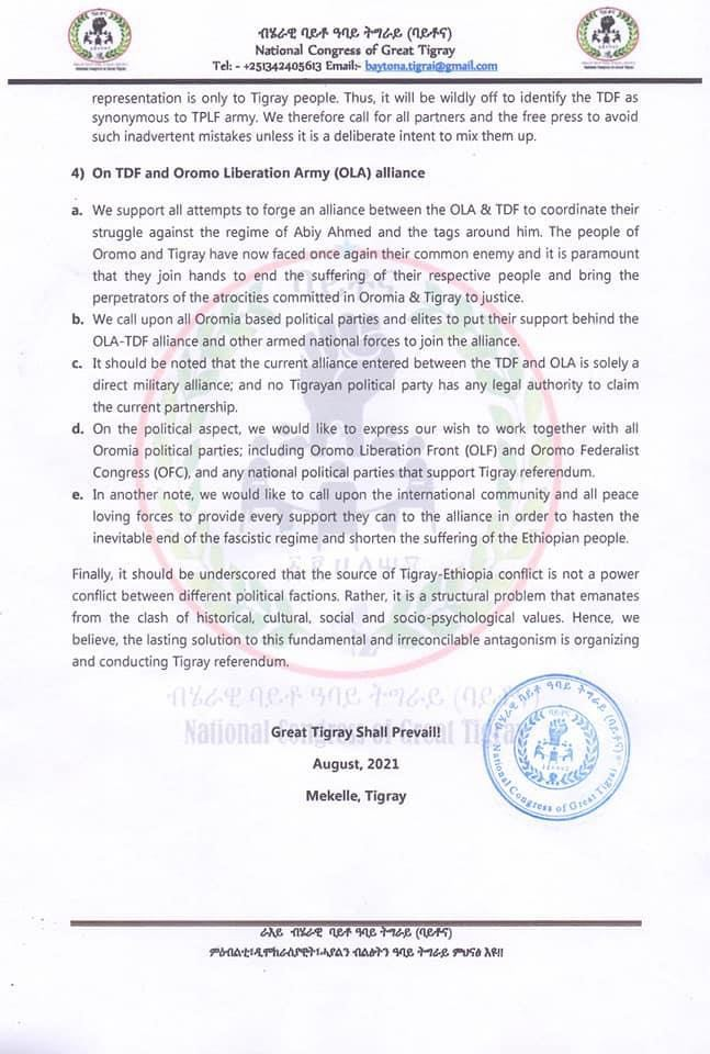 Our party had been opposing the cruel and genocidal forces alongside our people by all means necessary and will continue to do so until the legal & historical territorial integrity of Tigray is fully respected and the people of Tigray exercises it’s right to self-determination to realize great Tigray nation in the horn of Africa. We also note that the aforementioned objectives won't be met as long as the fascistic regime of Abiy Ahmed remains in power. Consequently, we shall strengthen our struggle until the forces standing on the way of our political aspirations are neutralized.
