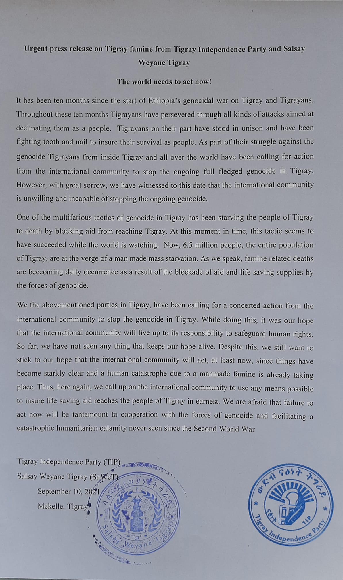 We the abovementioned parties in Tigray, have been calling for a concerted action from the international community to stop the genocide in Tigray. While doing this, it was our hope that the international community will live up to its responsibility to safeguard human rights. So far, we have not seen any thing that keeps our hope alive. Despite this, we still want to stick to our hope that the international community will act, at least now, since things have become starkly clear and a human catastrophe due to a manmade famine is already taking place. Thus, here again, we call up on the international community to use any means possible to insure life saving aid reaches the people of Tigray in earnest. We are afraid that failure to act now will be tantamount to cooperation with the forces of genocide and facilitating a catastrophic humanitarian calamity never seen since the Second World War.