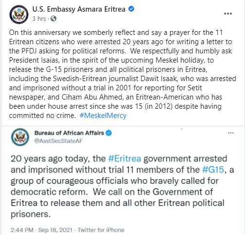 On this anniversary we somberly reflect and say a prayer for the 11 Eritrean citizens who were arrested 20 years ago for writing a letter to the PFDJ asking for political reforms. We respectfully and humbly ask President Isaias, in the spirit of the upcoming Meskel holiday, to release the G-15 prisoners and all political prisoners in Eritrea, including the Swedish-Eritrean journalist Dawit Isaak, who was arrested and imprisoned without a trial in 2001 for reporting for Setit newspaper, and Ciham Abu Ahmed, an Eritrean-American who has been under house arrest since she was 15 (in 2012) despite having committed no crime.