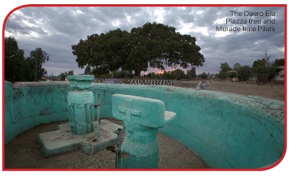A short distance to the east of the Daero Ella fig tree, in the middle of the road to the Stelae Park, is a small walled enclosure in which are set two Aksumite pillars, possibly from thrones similar to those in the Cathedral precinct. They are known as the Pillars of Saint Yard and are used at festivals and other occasions when the Ark of the Covenant is carried in procession around the outside of the cathedral precinct.