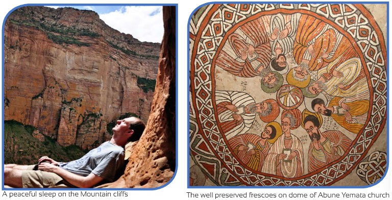 5 km west of Megab, there is a church, which does deserve special mention — Abune Yemata. This church requires almost vertical ascent. It does not take long to get there from the base and the visitor walks past ancient olive trees, small farmsteads and is then faced with a choice. To climb or not to climb up! Parts of the ascent are vertical for about 5 meters and there is no room for error. There are no ladders, no ropes and no hope if you fall. And yet there is a motivating force, which drives you on wards and upwards. When you are close to the entrance and you have succeeded in dealing with vertically you are faced with taking off your shoes and climbing over a bridge of rock with foot holds and hand grips in the rock face.