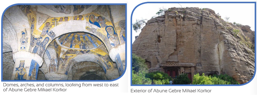 The Megab - Koraro road skirts the western foot side of Gheralta accompanied by various landscapes. The escarpment that overlays the settlement in the east is marked by pyramid-shaped stony hills of which one safeguards Abune Gebre Mikael, one of the best-preserved churches of the mountains. Considered one of the best and finest churches in Gherealta, this church's cruciform plan is hewn beautifully into a dome-like rock. It features vibrant frescoes and carefully carved columns, pillars, cupolas and arches. The church can be reached after driving 23 km of local road from Megab or 18 km from the departure of Abune Yemata (Guh) and after a sometimes demanding climb up a chimney in the mountain.