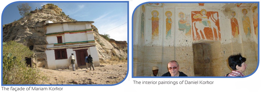 A short walk on to a rock ledge facing east, the entrance to Abba Daniel korkor, is a small church with only two rooms. The ceiling of the domed anteroom is decorated with primitive paintings. From the passage that takes to Daniel Korkor one enjoys the magnificent view of the mountains of Gheralta as well as of the Hawzien plains.