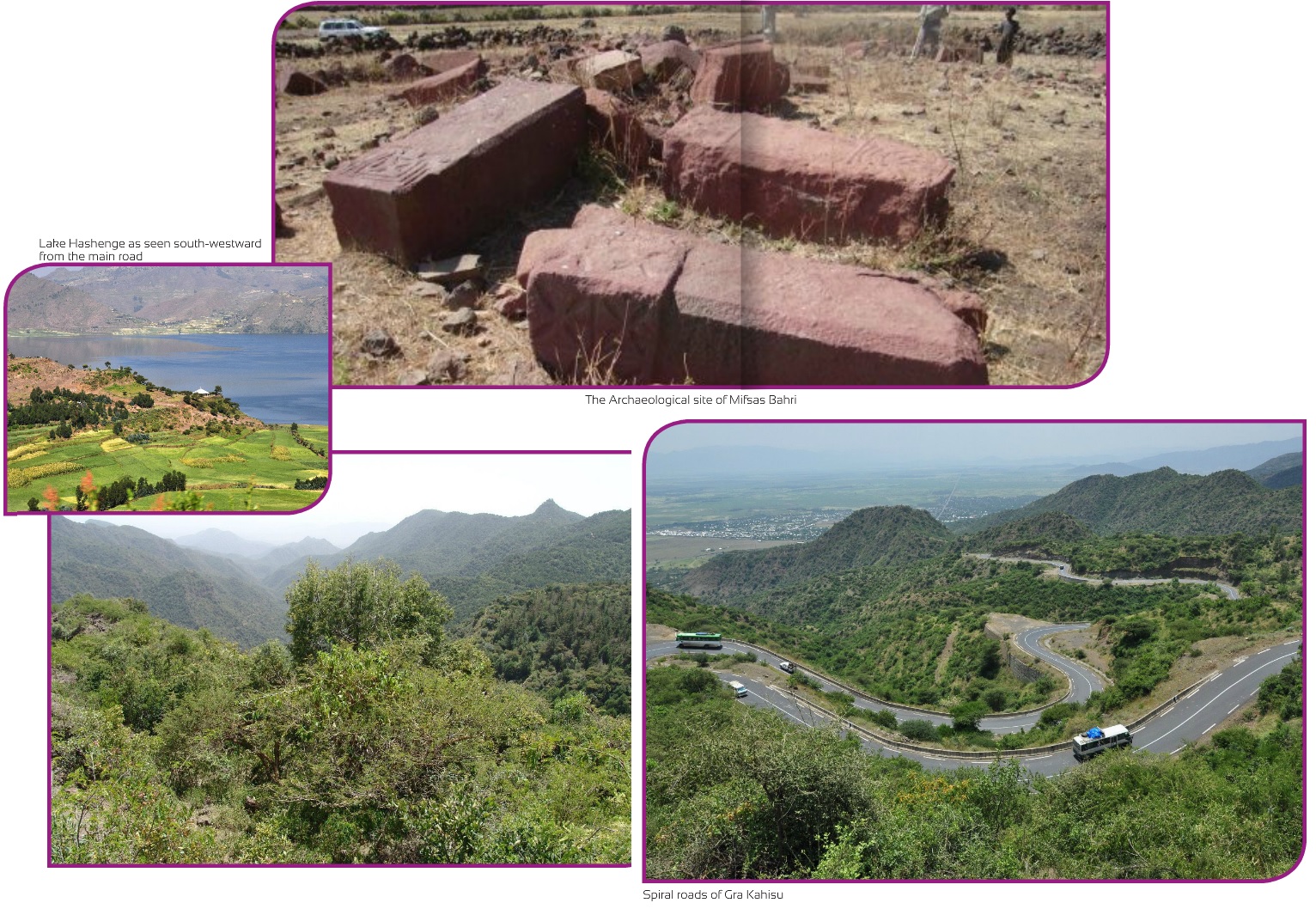 The way from Alamata to Korem, locally known as the Gira Kahsu climb, presents amazing scenery where the road climbs up the escarpment at an almost vertical slope, obliging the road to frequently turn almost 180 degrees at short distances and allowing the traveler to experience a sensation of climbing up stairs by a car. The town of Alamata left behind in the rift can be observed all along the traverse. The escarpment is covered by dense planted forest of pine trees and natural bushes and shrubs.