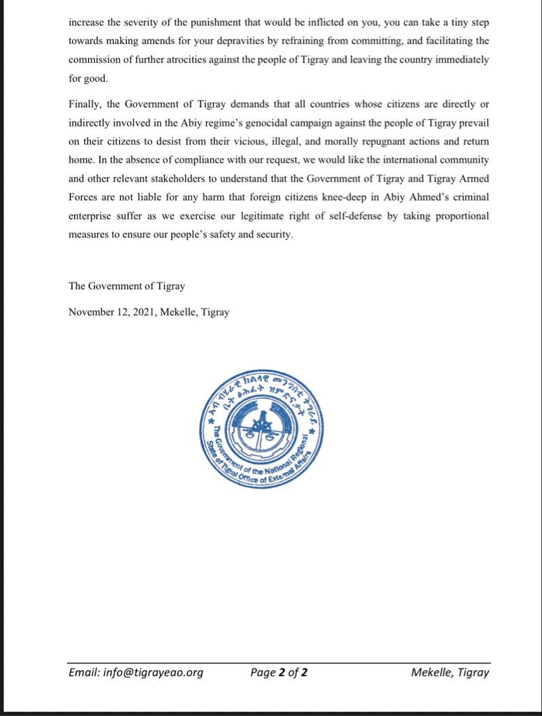 Finally, the Government of Tigray demands that all countries whose citizens are directly or indirectly involved in the Abiy regime's genocidal campaign against the people of Tigray prevail on their citizens to desist from their vicious, illegal, and morally repugnant actions and return home. In the absence of compliance with our request, we would like the international community and other relevant stakeholders to understand that the Government of Tigray and Tigray Army Forces are not liable for any harm that foreign citizens knee-deep in Abiy Ahmed's criminal enterprise suffer as we exercise our legitimate right of self-defense by taking proportional measures to ensure our people's safety and security.