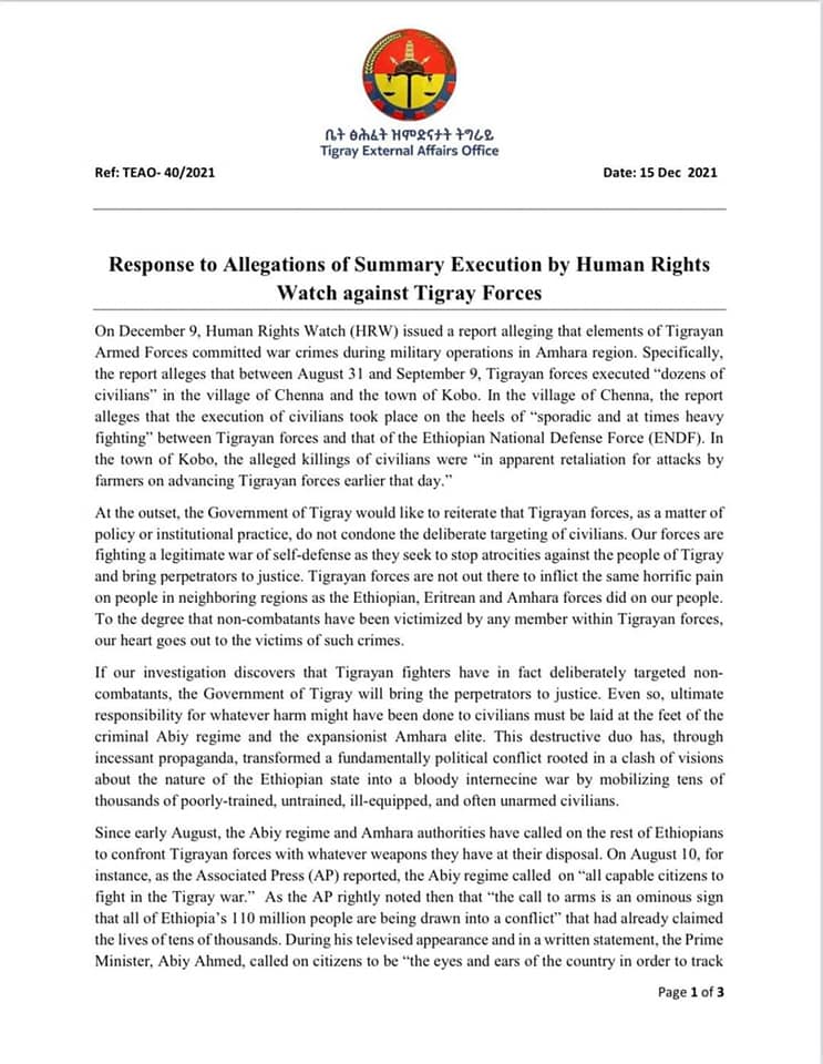 Response to Allegations of Summary Execution by Human Rights Watch against Tigray Forces
