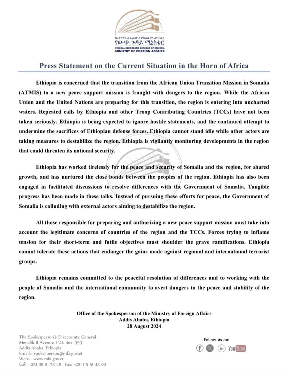 Ethiopia - Press Statement on the Current Situation in the Horn of Africa
