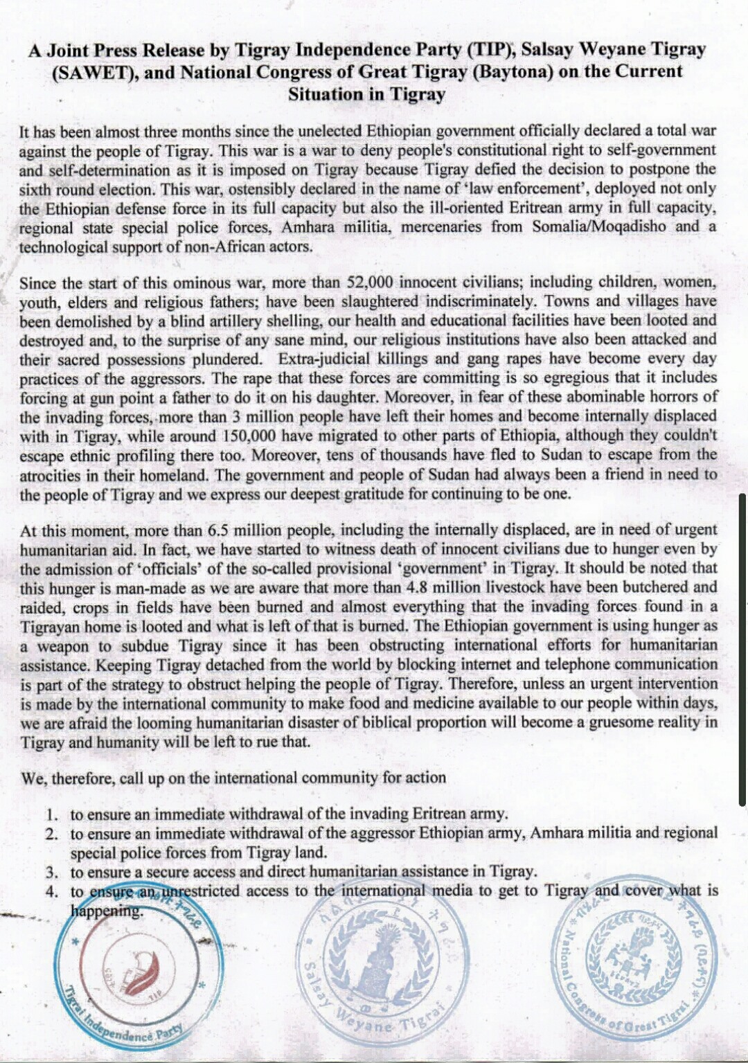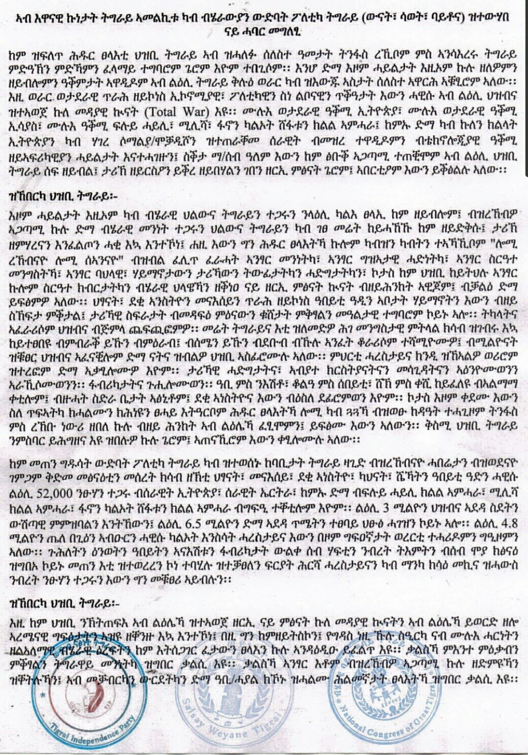ህዝቢ ትግራይ ከም ህዝቢ ንከይጠፍእ ኣብ ዝገብሮ ዘሎ ኩለ መዳያዊ ቃልሲ ግፍዐኛታት ዝገብርዎ ዘለው ኣረሜናዊ ጨፍጫፍን ዘውርድሉ ዘለው ማእለያ ዘይብሉ ሓሳረ-መከራን ዓለም ከይትፈልጥ፤ ብኽያት ህዝብና እውን ከይትሰምዕ፤ ኩሎም ምስ ዓለም ዘራኽቡ በርታት ተዓፅዮምዎ ኣማራፂ ስኢኑ ኣብ ዘለሉ ኣብዚ ሕሱም እዋን እዚ ድምፂ ህዝብኹም ብምኻን ኣብ ልዕሊ ህዝብና ይበፅሕ ዘሎ ኢኮኖሚያዊ፣ ወታደራዊ፣ ፖለቲካዊ፣ ስነ ልቦናዊ፤ ኮታስ ኩሎም ዓይነታት ጥቕዓት ብዝግባእ ብምግዋሕን ብምቅላዕን ዓለም ንክትግንዘብ እትገብርዎ ዘለኹም ዘይተሓለለ ቃልሲ ኣዝዩ ዝነኣድን መተካእታ ዘይብሉን እዩ፡፡ ብሳላ ቃልስኹም ድማ ዓለም ንፀገም ህዝብና ዓይና ክትከፍት ጀሚራ ኣላ እሞ እዚ መተካእታ ዘይብሉ ስራሕኹም ኣበርቲዕኹም ንኽትቅፅሉሉ ንላቦ፡፡
