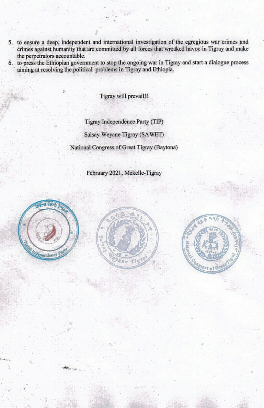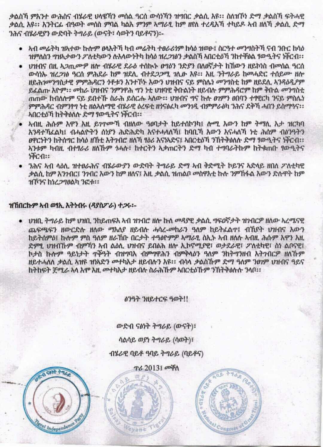 ንሕና ኣብ ላዕሊ ዝተፀራሕና ብሄራውያን ውድባት ትግራይ ድማ ኣብ ቅድሚት ኮይንና ኣድላይ ዘበለ ፖለቲካዊ ቃልሲ ከም እንገብር፤ ንገብር እውን ከም ዘለና፤ እዚ ቃልሲ ዝጠልቦ መስዋእቲ ኩሉ ንምኽፋል እውን ድሉዋት ከም ዝኾንና ክነረጋግፀልካ ንፎቱ፡፡