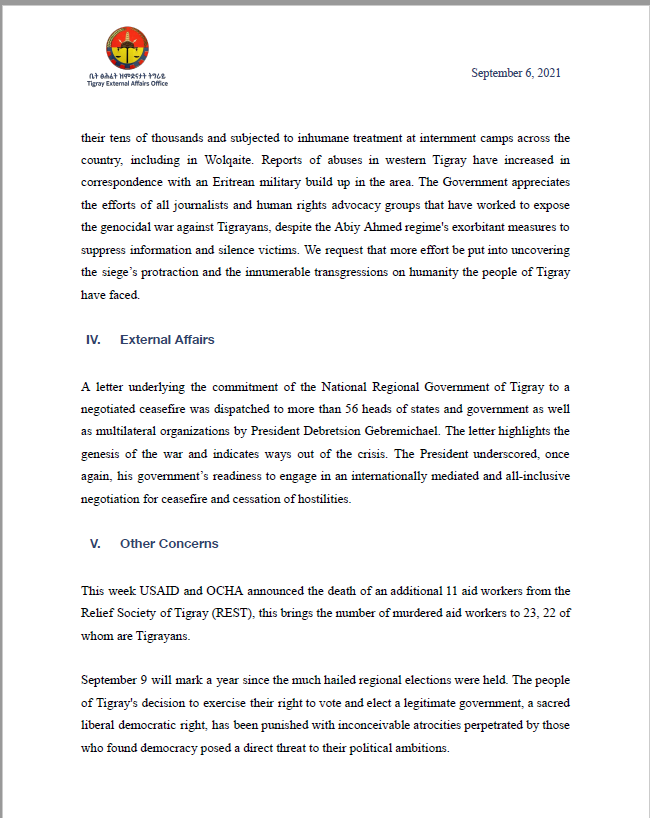 Reports continue to surface of mutilated Tigrayan bodies along the rivers of western Tigray as genocidal persecutions intensify in Wolqaite. Tigrayans are being forcibly disappeared in their tens of thousands and subjected to inhumane treatment at internment camps across the country, including in Wolqaite. Reports of abuses in western Tigray have increased in correspondence with an Eritrean military build up in the area. The Government appreciates the efforts of all journalists and human rights advocacy groups that have worked to expose the genocidal war against Tigrayans, despite the Abiy Ahmed regime's exorbitant measures to suppress information and silence victims. We request that more effort be put into uncovering the siege’s protraction and the innumerable transgressions on humanity the people of Tigray have faced.