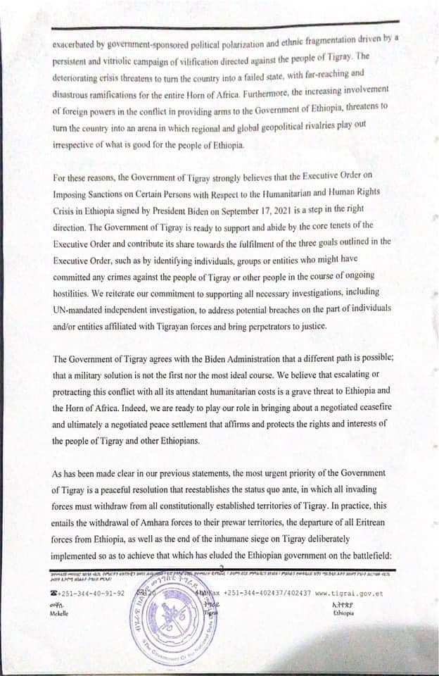 For these reasons, the Government of Tigray strongly believes that the Executive Order on Imposing Sanctions on Certain Persons with Respect to the Humanitarian and Human Rights Crisis in Ethiopia signed by President Biden on September 17, 2021 is a step in the right direction. The Government of Tigray is ready to support and abide by the core tenets of the Executive Order and contribute its share towards the fulfilment of the three goals outlined in the Executive Order, such as by identifying individuals, groups or entities who might have committed any crimes against the people of Tigray or other people in the course of ongoing hostilities. We reiterate our commitment to supporting all necessary investigations, including UN-mandated independent investigation, to address potential breaches on the part of individuals and/or entities affiliated with Tigrayan forces and bring perpetrators to justice.