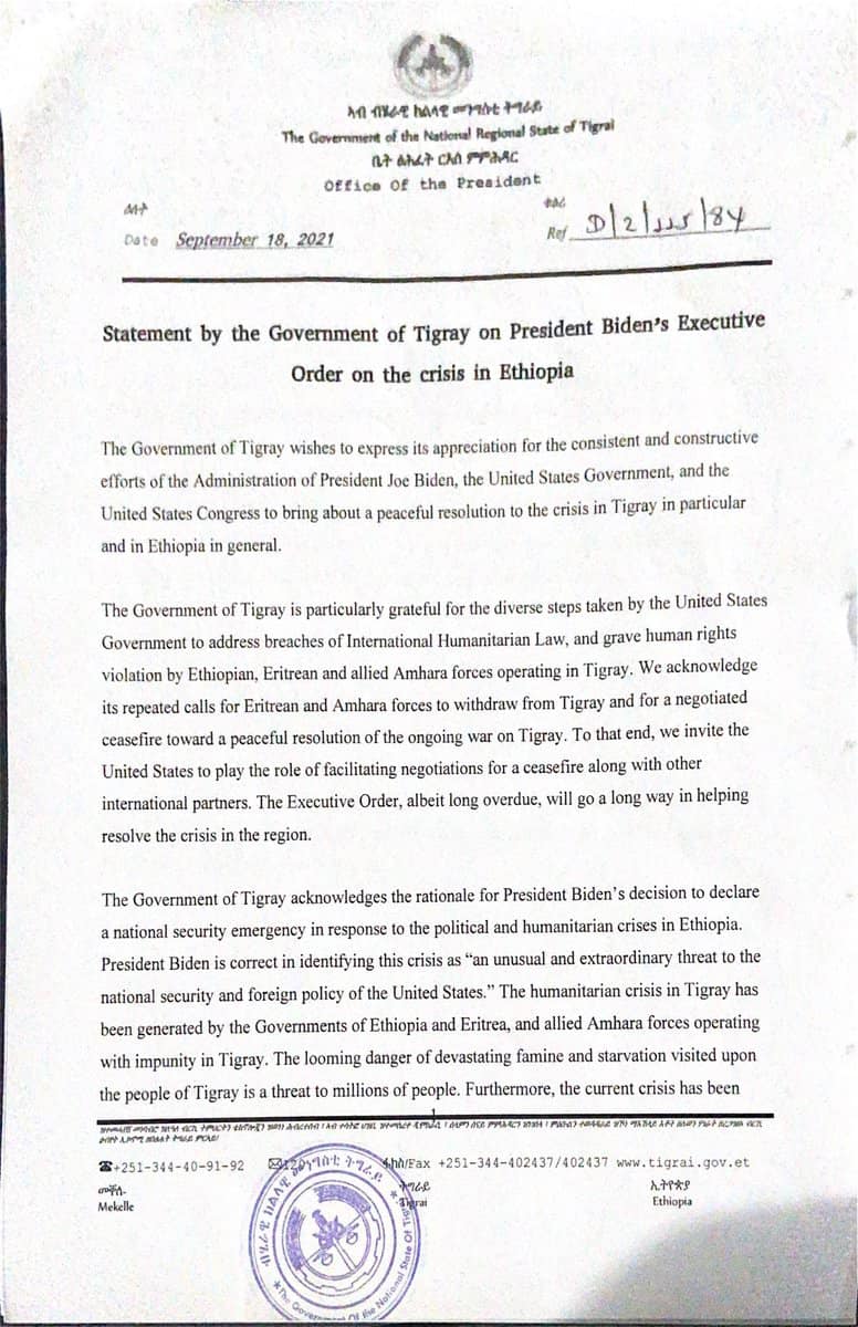 The Government of Tigray acknowledges the rationale for President Biden’s decision to declare a national security emergency in response to the political and humanitarian crises in Ethiopia. President Biden is correct in identifying this crisis as “an unusual and extraordinary threat to the national security and foreign policy of the United States.” The humanitarian crisis in Tigray has been generated by the Governments of Ethiopia and Eritrea, and allied Amhara forces operating with impunity in Tigray. The looming danger of devastating famine and starvation visited upon the people of Tigray is a threat to millions of people.