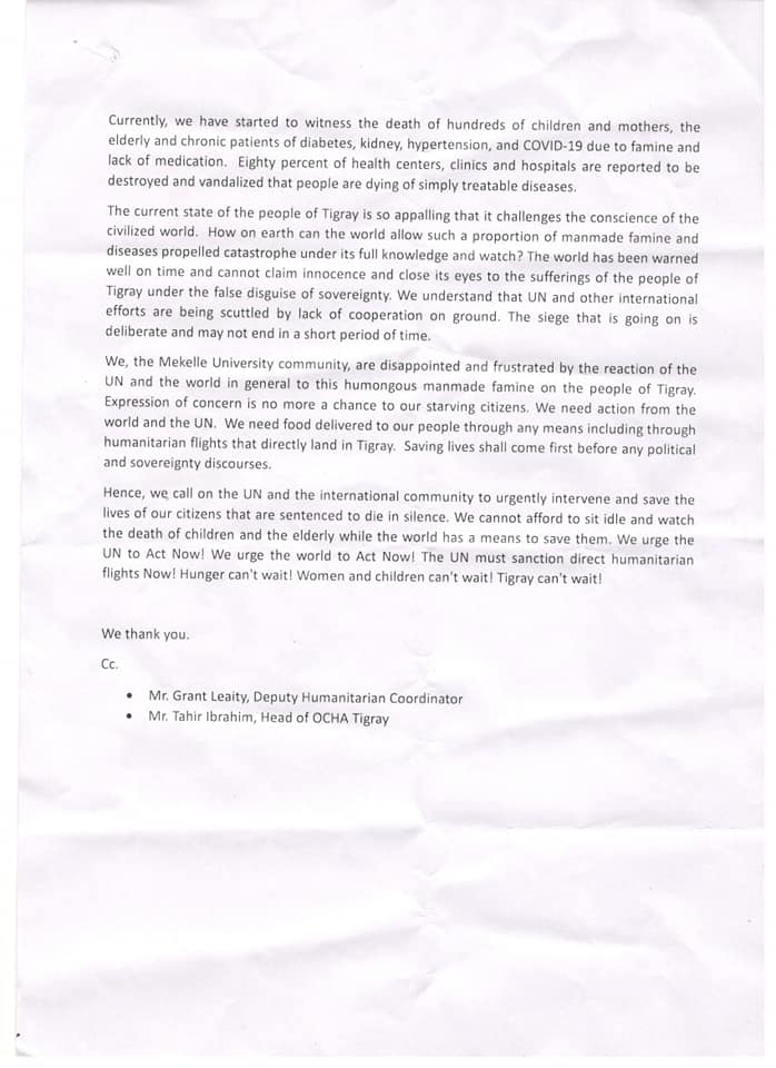 Currently, we have started to witness the death of hundreds of children and mothers, the elderly and chronic patients of diabetes, kidney, hypertension, and COVID-19 due to famine and lack of medication. Eighty percent of health centers, clinics and hospitals are reported to be destroyed and vandalized that people are dying of simply treatable diseases. The current state of the people of Tigray is so appalling that it challenges the conscience of the civilized world. How on earth can the world allow such a proportion of man-made famine and diseases propelled catastrophe under its full knowledge and watch? The world has been warned well on time and cannot claim innocence and close its eyes to the sufferings of the people of Tigray under the false disguise of sovereignty. We understand that UN and other international efforts are being scuttled by lack of cooperation on ground. The siege that is going on is deliberate and may not end in a short period of time. We, the Mekelle University community, are disappointed and frustrated by the reaction of the UN and the world in general to this humongous manmade famine on the people of ,gray. Expression of concern is no more a chance to our starving citizens. We need action from the world and the UN. We need food delivered to our people through any means including through humanitarian flights that directly land in Tigray. Saving lives shall come first before any political and sovereignty discourses. Hence, we call on the UN and the international community to urgently intervene and save the lives of our citizens that are sentenced to die In silence. We cannot afford to sit idle and watch the death of children and the elderly while the world has a means to save them.