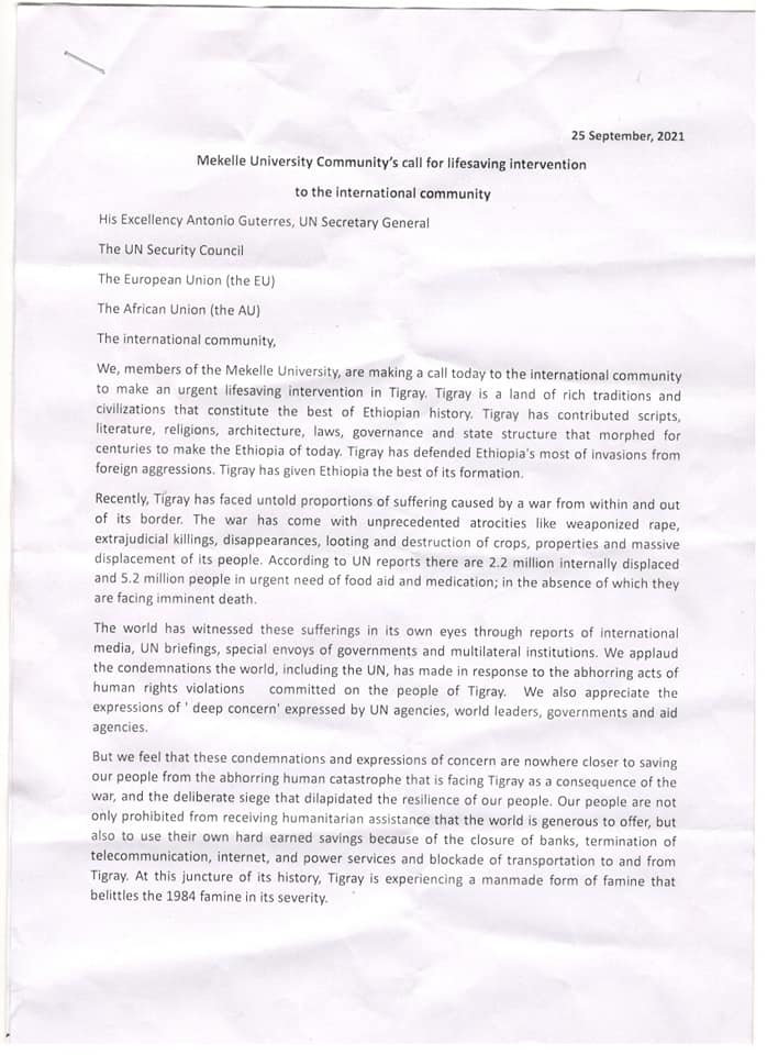 25 September, 2021 - Mekelle University Community’s call for lifesaving intervention to the International community