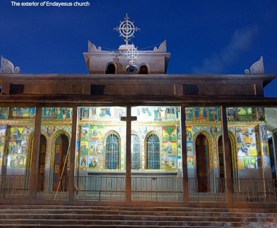 Enda Eyesus Church is situated in the Northern Stelae field. It is separated from the field by stone walls. The church is known for its murals. It is decorated wall to wall by paintings depicting several subjects. St. Mary and Child, the apostles, saints, among other things, adorn the external walls of the church. The churchyard is also a site of several stelae, some of which are decorated. One decorated stele, the top of which Is full-moon shaped, is the prominent structure in the churchyard of Enda Eyesus.