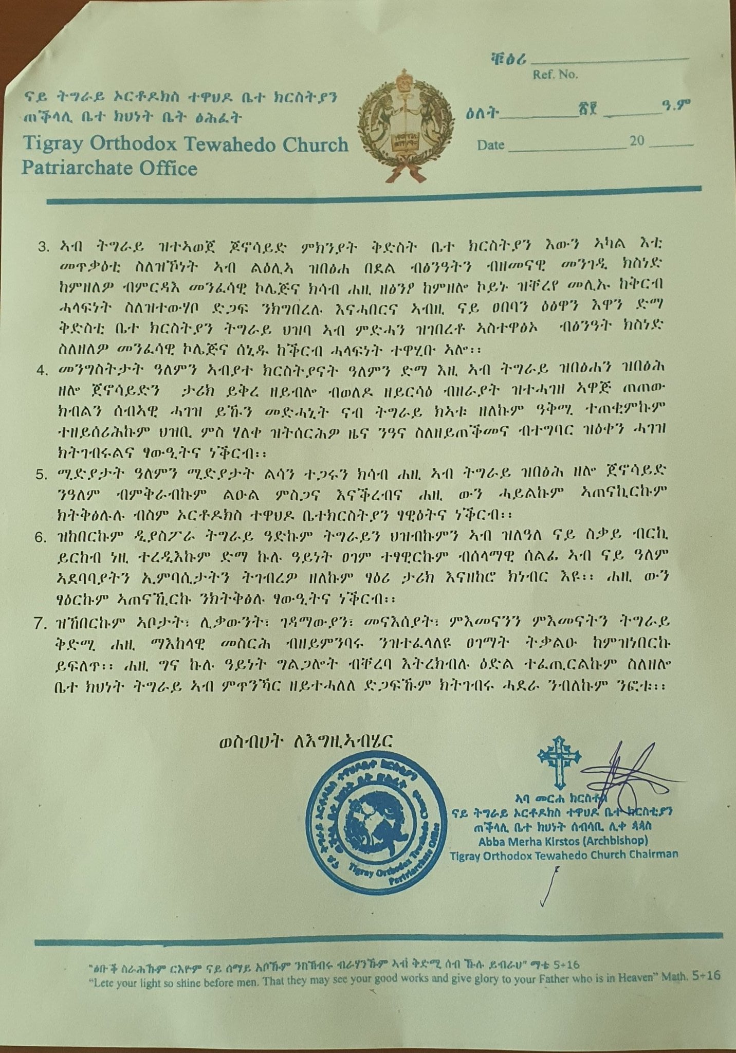 Tigray Orthodox Tewahedo Church Patriarchate has been officially formed. The Patriarchate says it will work to return the church's seat to the seat of Abuna Salama, the founder and first patriarch of the church in Aksum.
