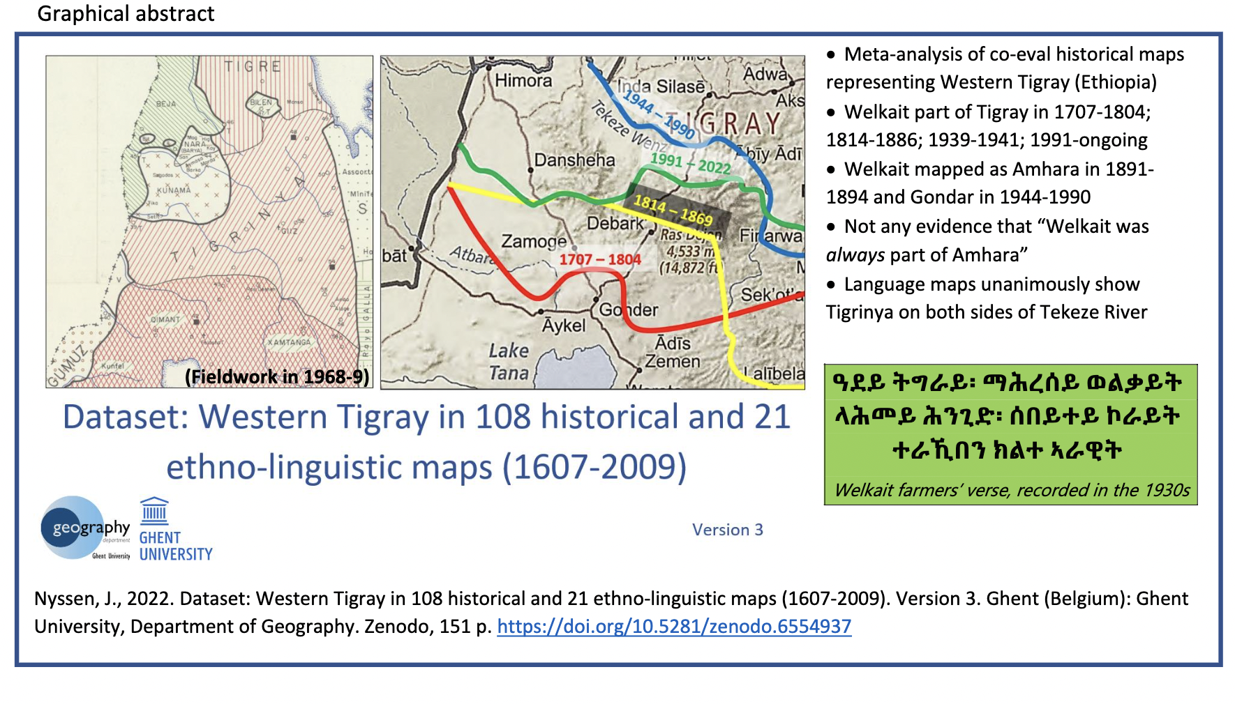 Ten additional maps of northern Ethiopia have been uncovered by Professor Jan Nyssen and his team at the Department of Geography at Ghent University, so that a new version of the dataset could be published: Western Tigray in 108 historical and 21 ethno-linguistic maps (1607-2009) (version 3). You may consult it at: https://doi.org/10.5281/zenodo.6554937