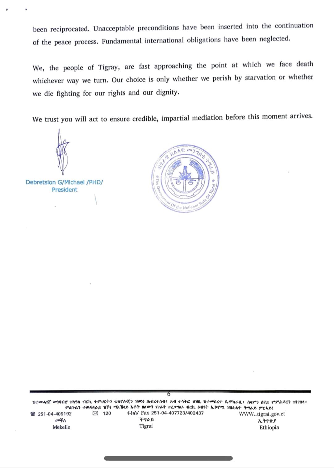 Open letter from the President of the Government of Tigray