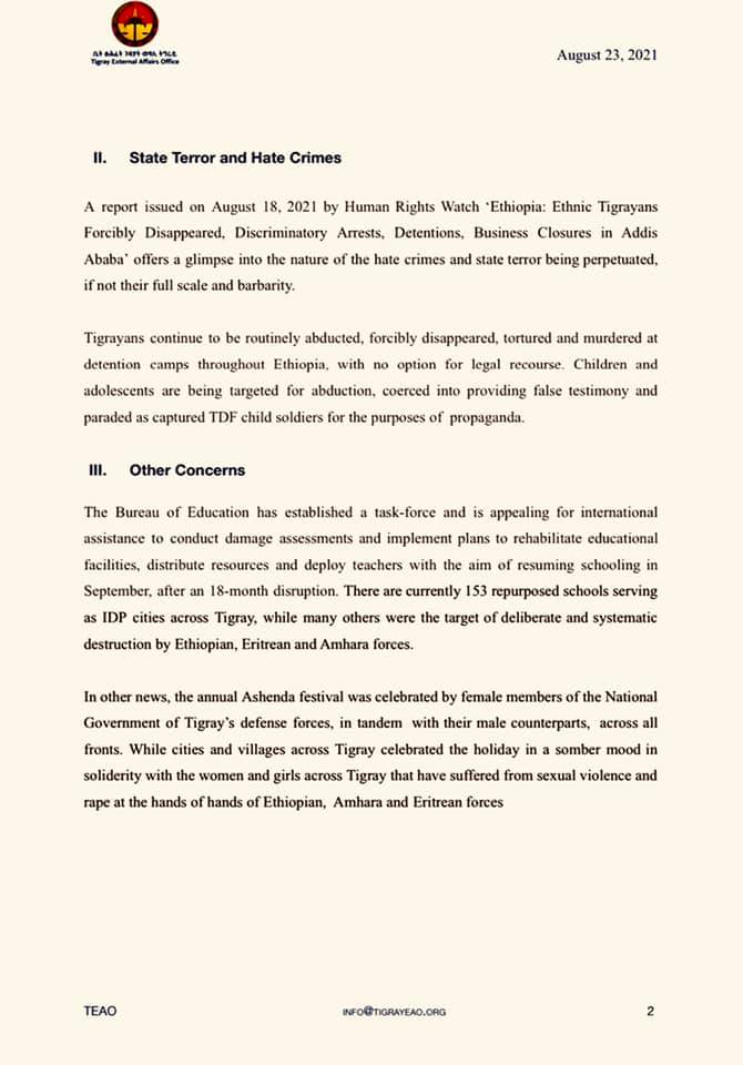 In other news, the annual Ashenda festival was celebrated by female members of the National Government of Tigray’s defense forces, in tandem with their male counterparts, across all fronts. While cities and villages across Tigray celebrated the holiday in a somber mood in soliderity with the women and girls across Tigray that have suffered from sexual violence and rape at the hands of hands of Ethiopian, Amhara and Eritrean forces.