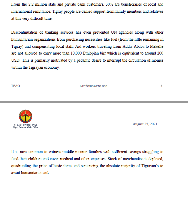 Discontinuation of banking services has even prevented UN agencies along with other humanitarian organizations from purchasing necessities like fuel (from the little remaining in Tigray) and compensating local staff. Aid workers traveling from Addis Ababa to Mekelle are not allowed to carry more than 10,000 Ethiopian birr which is equivalent to around 200 USD. This is primarily motivated by a pedantic desire to interrupt the circulation of monies within the Tigrayan economy.