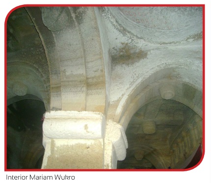 This chamber is highly decorated with stone bas-reliefs and relatively recent paintings. The western and southern parts of the ceiling have large, carved Greek crosses, and the northern and the central part of ceiling have geometrically perfect domes. The ceiling is supported on two free-standing pillars. The remarkable feature of the church is that the pillars are connected by double arches, and have no central pillars. A wooden door leads to the inner altar. The interior measures 10m x 9m x 9m. Four free—standing pillars with pilaster capitals on top, plus another 10 wall-pillars support the ceiling. On the western side of the Holy of Holies, one can see a window—like opening in Aksumite style. In fact in many respects, the church is similar to those churches of Lalibala and Debre Damo as well. According to David Buxton, one of the noted authorities of the rock-hewn churches of Tigray, Enda Mariam Wukro "shows clear kinship with the built church of Debre Damo". He further states that the church has "some important" kinship with Lalibela churches — Mariam, Amanuel and Abba Libanos specifically. Another chapel, accessible by a wooden ladder, houses the Tabot of St George. Enda Mariam Wukro is a very complex and magnificent church. According to scholar Ruth Plant, it is "without doubt a great example of Tigray architecture".
