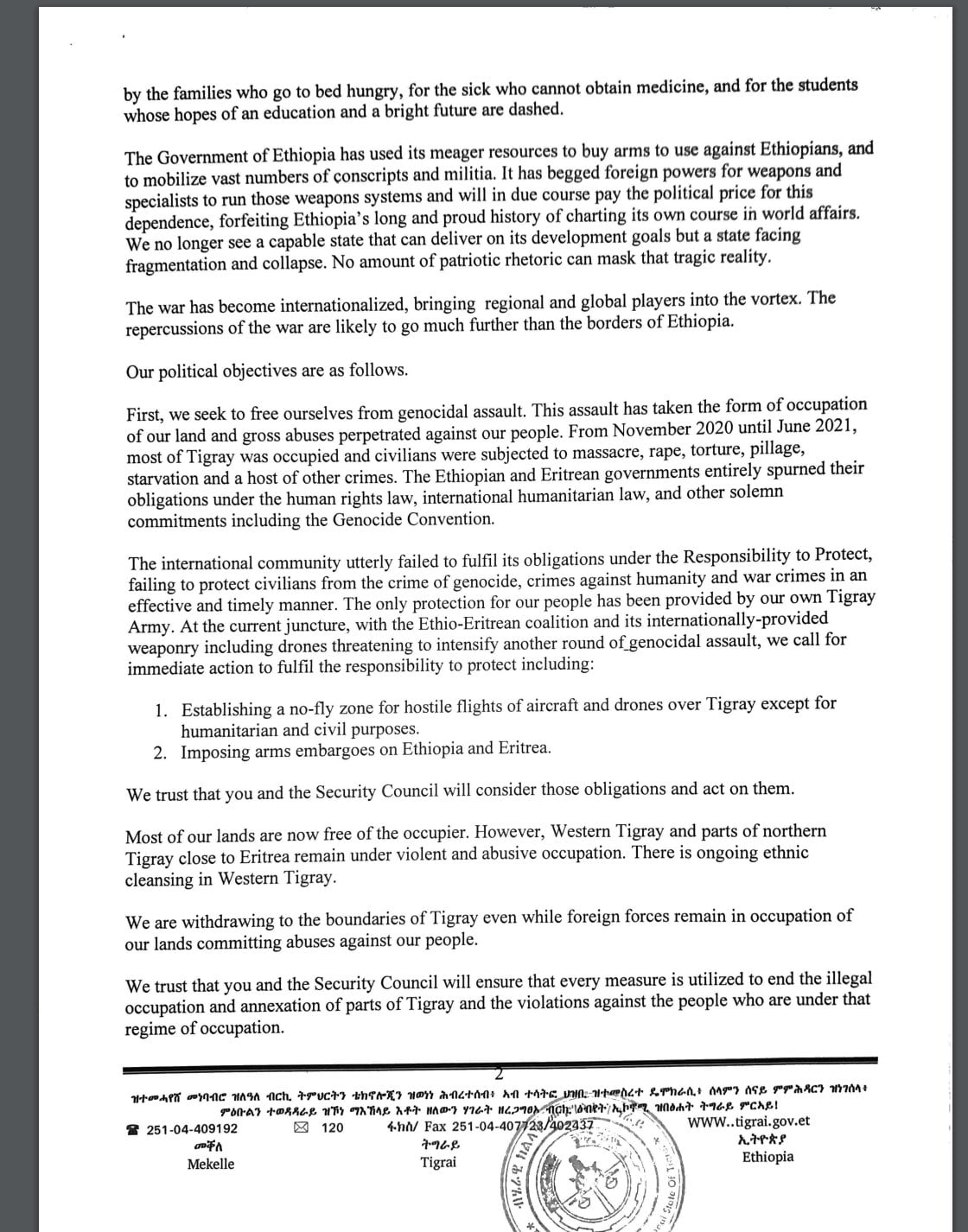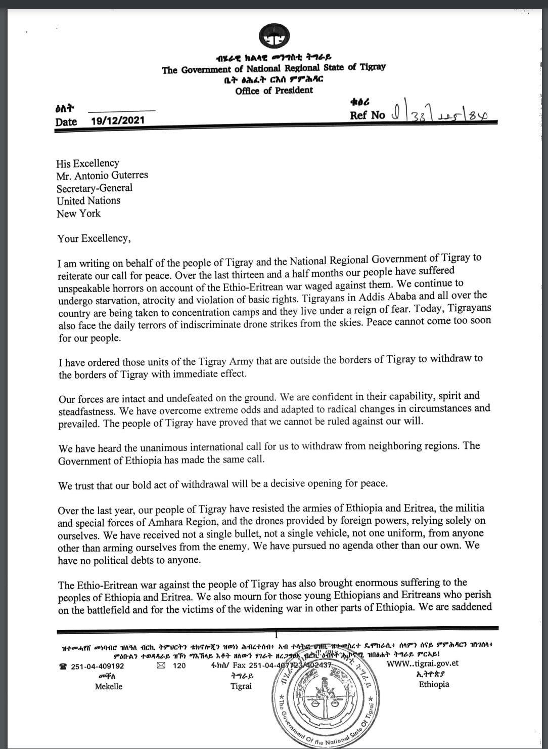 Breaking: In a letter to the UN sent yesterday, Tigray president Debretsion Gebremichael said he had ordered all his troops to withdraw to the borders of Tigray.