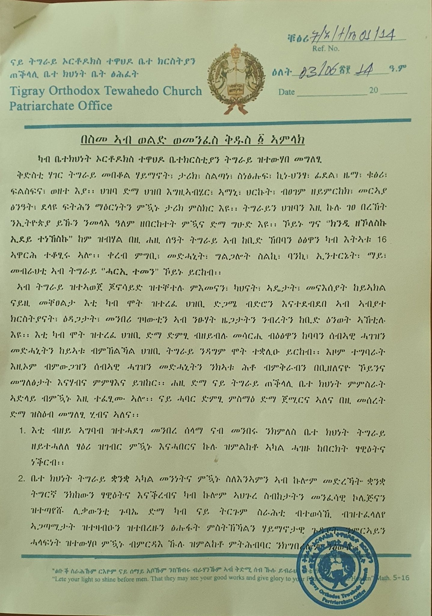 Tigray Orthodox Tewahedo Church Patriarchate has been officially formed. The Patriarchate says it will work to return the church's seat to the seat of Abuna Salama, the founder and first patriarch of the church in Aksum.