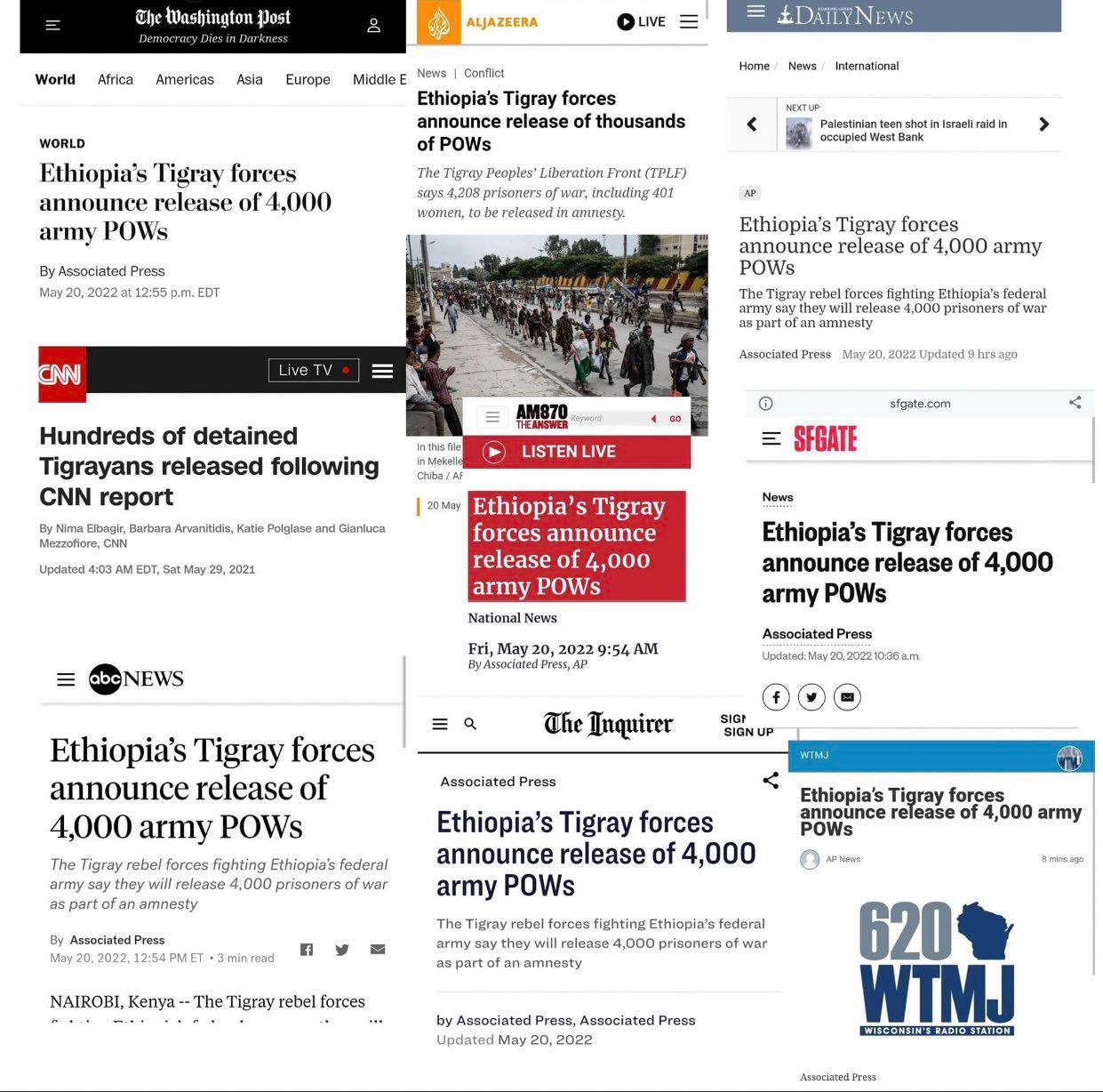 ታዋቂ አለም አቀፍ ሚድያዎች የትግራይ መንግስት ከ4,000 በላይ የኢትዮጵያ ምርኮኞች በይቅርታ እንደለቀቀ በመዝገብ ላይ ይገኛሉ