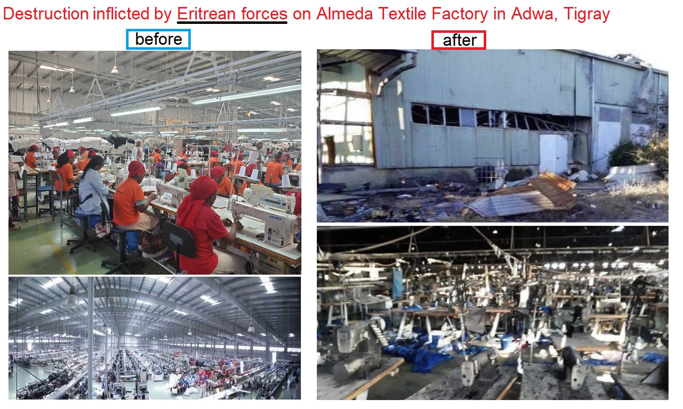የኤርትራ ወታደሮች ዘረፋ ለመናገር ይከብዳል። በአድዋ ሆስፒታል በሽተኛችን ከተኛበት አልጋ በማስወረድ አልጋ እና ዊል ቸር ተዘርፏል። የህክምና ቁሳቁስ በመዘረፉም ሰዎች ከህክምና እጦት የተነሳ ህይወታቸውን እያጡ ነው። አርዓያ አሽከርካሪ የነበር ትርፍ አንጀት ይዞት ሆስፒታል ቢወስድም የቅዶ ህክምና ማድረጊያ ምላጭ እና መስፊያ በሙሉ በመዘረፉ ህክምና ሳያገኝ ህይወቱ አልፏል። ከመቀሌ ዩኒቨርሲቲ በስተቀር አዲግራት እና በአክሱም ዩኒቨርሲቲ ተዘርፎ ባዶውን ቀርቷል። ኮምፒየትር ጠርጴዛ ተሽከርካሪ መኪኖች በሙሉ ተዘርፈዋል።