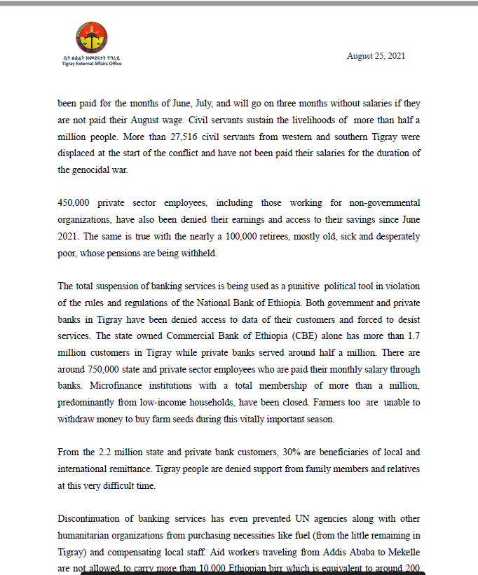 Discontinuation of banking services has even prevented UN agencies along with other humanitarian organizations from purchasing necessities like fuel (from the little remaining in Tigray) and compensating local staff. Aid workers traveling from Addis Ababa to Mekelle are not allowed to carry more than 10,000 Ethiopian birr which is equivalent to around 200 USD. This is primarily motivated by a pedantic desire to interrupt the circulation of monies within the Tigrayan economy.