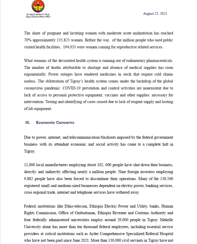 Federal institutions like Ethio-telecom, Ethiopia Electric Power and Utility, banks, Human Rights Commission, Office of Ombudsman, Ethiopia Revenue and Customs Authority and four federally administered universities employ around 29,000 people in Tigray. Mekelle University alone has more than ten thousand federal employees, including essential service providers at critical institutions such as Ayder Comprehensive Specialized Referral Hospital who have not been paid since June 2021. More than 130,000 civil servants in Tigray have not been paid for the months of June, July, and will go on three months without salaries if they are not paid their August wage. Civil servants sustain the livelihoods of more than half a million people. More than 27,516 civil servants from western and southern Tigray were displaced at the start of the conflict and have not been paid their salaries for the duration of the genocidal war.