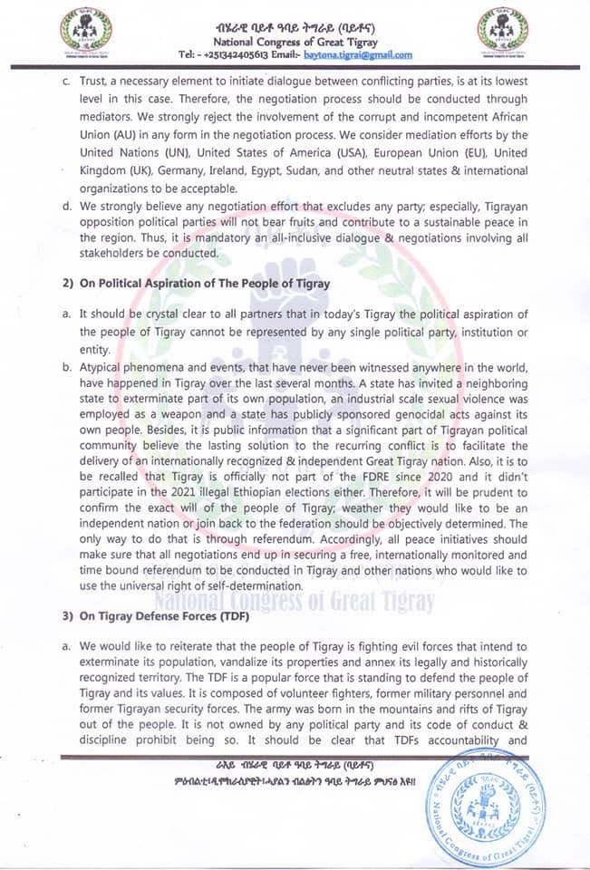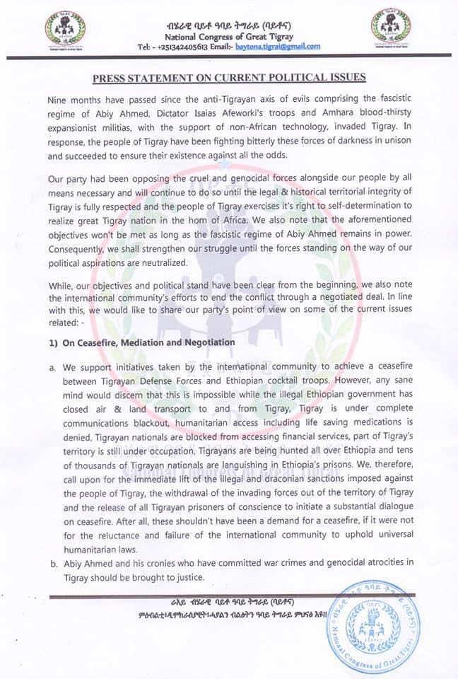 Our party had been opposing the cruel and genocidal forces alongside our people by all means necessary and will continue to do so until the legal & historical territorial integrity of Tigray is fully respected and the people of Tigray exercises it’s right to self-determination to realize great Tigray nation in the horn of Africa. We also note that the aforementioned objectives won't be met as long as the fascistic regime of Abiy Ahmed remains in power. Consequently, we shall strengthen our struggle until the forces standing on the way of our political aspirations are neutralized.