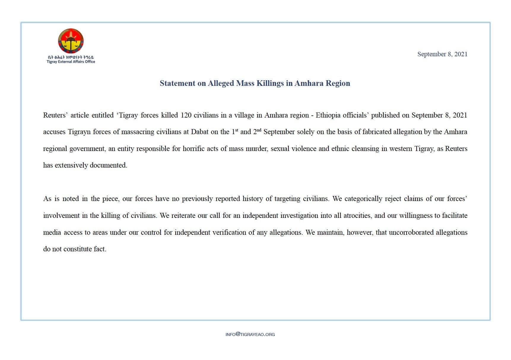 Reuters’ article entitled ‘Tigray forces killed 120 civilians in a village in Amhara region - Ethiopia officials’ published on September 8, 2021 accuses Tigrayn forces of massacring civilians at Dabat on the 1st and 2nd September solely on the basis of fabricated allegation by the Amhara regional government, an entity responsible for horrific acts of mass murder, sexual violence and ethnic cleansing in western Tigray, as Reuters has extensively documented.