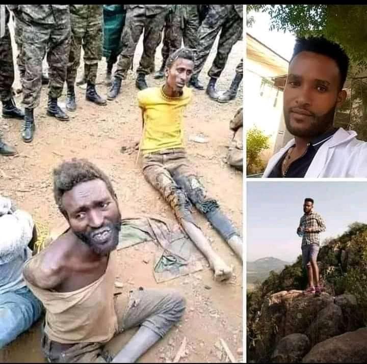 ቢጫ የለበሰዉ ልጅ ዶ/ር ክብሮም ሀይለ ይባላል በአድዋ ሆስፒታል ይሰራ ነበር። የ ፋሺስት ኣቢይ ኣሕመድ ዓሊ ሰራዊት በዚ ሁኔታ ካሰቃይዋቸዉ በሃላ ከጓደኞቹ ጋር ገድለዉታል።