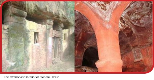 Built in the 15th century, Mariam Hibito (The Hidden Mary) is really hidden in a foot hill and surrounded by old green trees. Unlike in many other rock-hewn churches of Tigray, the carvers of this structure had much time to spend in beautifying its exterior. To say the least, they have cut out four free-standing columns reminiscent of those at Medhane Alem Addi Kesho.