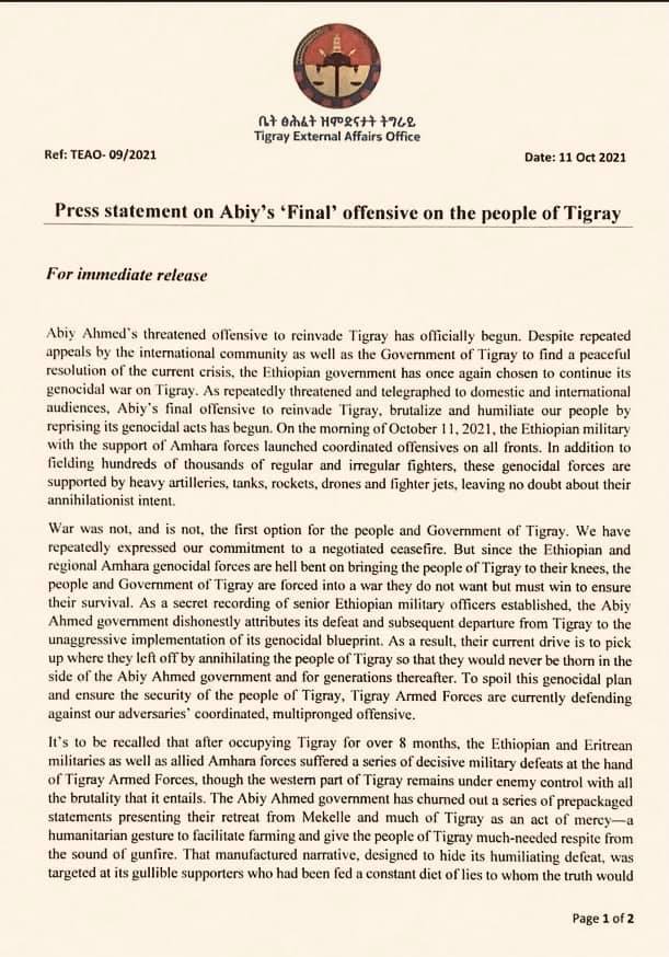 Ably Ahmed's threatened offensive to reinvade Tigray has officially begun. Despite repeated appeals by the international community as well as the Government of Tigray to find a peaceful resolution of the current crisis, the Ethiopian government has once again chosen to continue its genocidal war on Tigray. As repeatedly threatened and telegraphed to domestic and international audiences, Abiy's final offensive to reinvade Tigray, brutalize and humiliate our people by reprising its genocidal acts has begun. On the morning of October 11, 2021, the Ethiopian military, with the support of Amhara forces launched coordinated offensives on all fronts. In addition to fielding hundreds of thousands of regular and irregular fighters, these genocidal forces are supported by heavy artilleries, tanks, rockets, drones and fighter jets, leaving no doubt about their annihilationist intent.