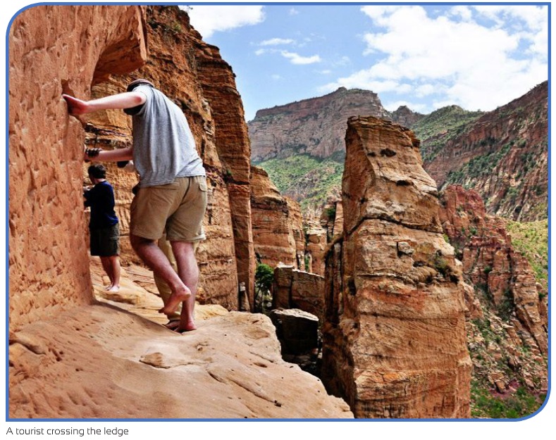 5 km west of Megab, there is a church, which does deserve special mention — Abune Yemata. This church requires almost vertical ascent. It does not take long to get there from the base and the visitor walks past ancient olive trees, small farmsteads and is then faced with a choice. To climb or not to climb up! Parts of the ascent are vertical for about 5 meters and there is no room for error. There are no ladders, no ropes and no hope if you fall. And yet there is a motivating force, which drives you on wards and upwards. When you are close to the entrance and you have succeeded in dealing with vertically you are faced with taking off your shoes and climbing over a bridge of rock with foot holds and hand grips in the rock face.