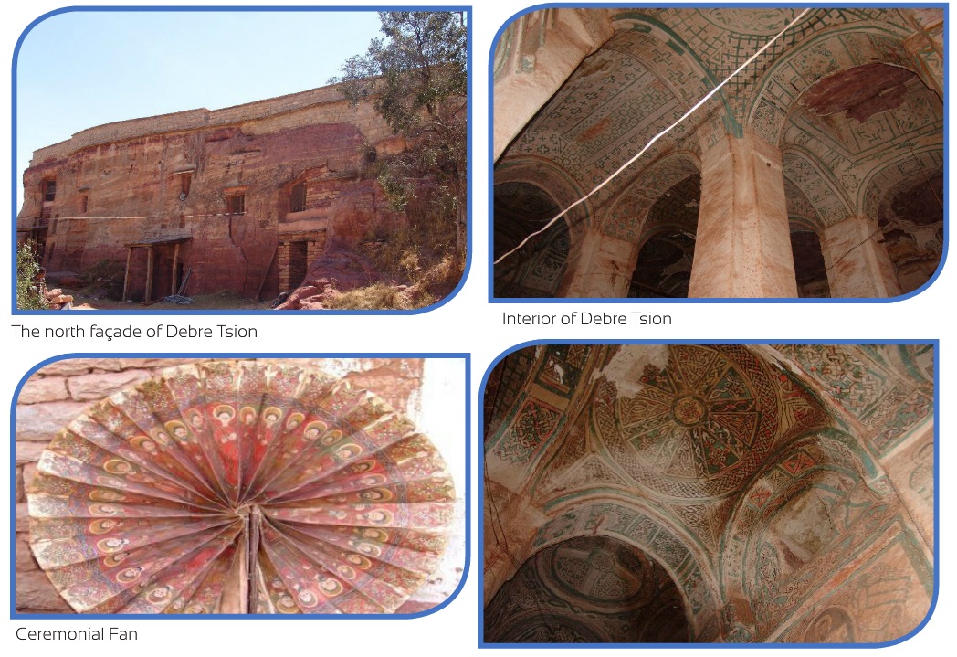 A km after Degum, a gravel road turns about west to come to a crag whose top supports the church of Debretsion. It is architecturally most outstanding and entirely hewn from living rock. Inside this church, among other things to see, the back walls of the holy of holies, the domes and wall panels are abundantly decorated with fine paintings of Saints and Apostles. Especially the dome is beautifully adorned with patterns. The structure incorporates a dome like chamber decorated with many geometrical designs and carvings in relief depicting Angels and Saints. The monument in brief, a manifestation of great workmanship possesses 15th century unique circular ceremonial fan.