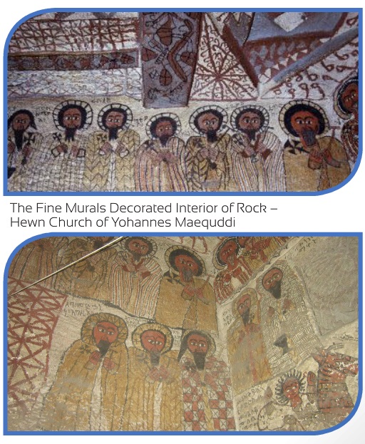 This church is rectangular in shape and has six free-standing pillars which curve to meet each other and thereby support a ceiling carved with geometrical designs. The church contains many early paintings which are thought to be at least 300 years old, and are very different in style to any other church paintings found in Gheralta. The walls of the building are dressed with murals of saints and apostles; it is the intense atmosphere that most visitors remember. The relic is reached from the village of Metari, about 1km south of Degum. It is continued by a steep footpath, roughly 40 minutes hike in average.