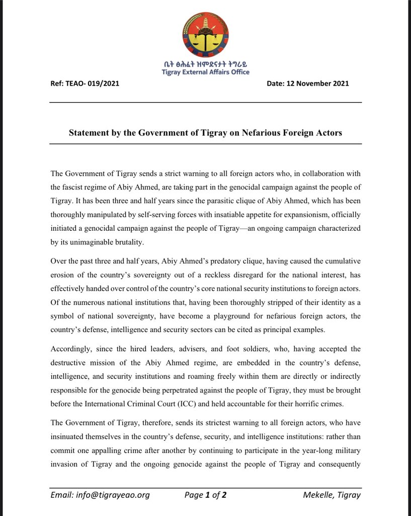 The Government of Tigray, therefore, sends its strictest warning to all foreign actors, who have insinuated themselves in the country's defense, security, and intelligence institutions: rather than commit one appalling crime after another by continuing to participate in the year-long military invasion of Tigray and the ongoing genocide against the people of Tigray and consequently increase the severity of the punishment that would be inflicted on you, you can take a tiny step towards making amends for your depravities by refraining from committing, and facilitating the commission of further atrocities against the people of Tigray, and leaving the country immediately for good.