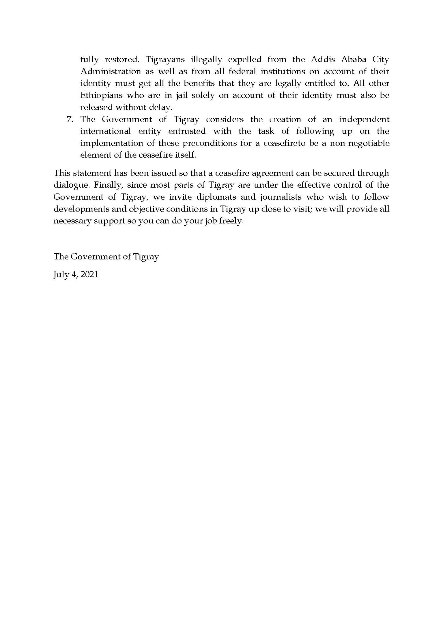 7. The Government of Tigray considers the creation of an independent international entity entrusted with the task of following up on the implementation of these preconditions for a ceasefire to be a non-negotiable element of the ceasefire itself.