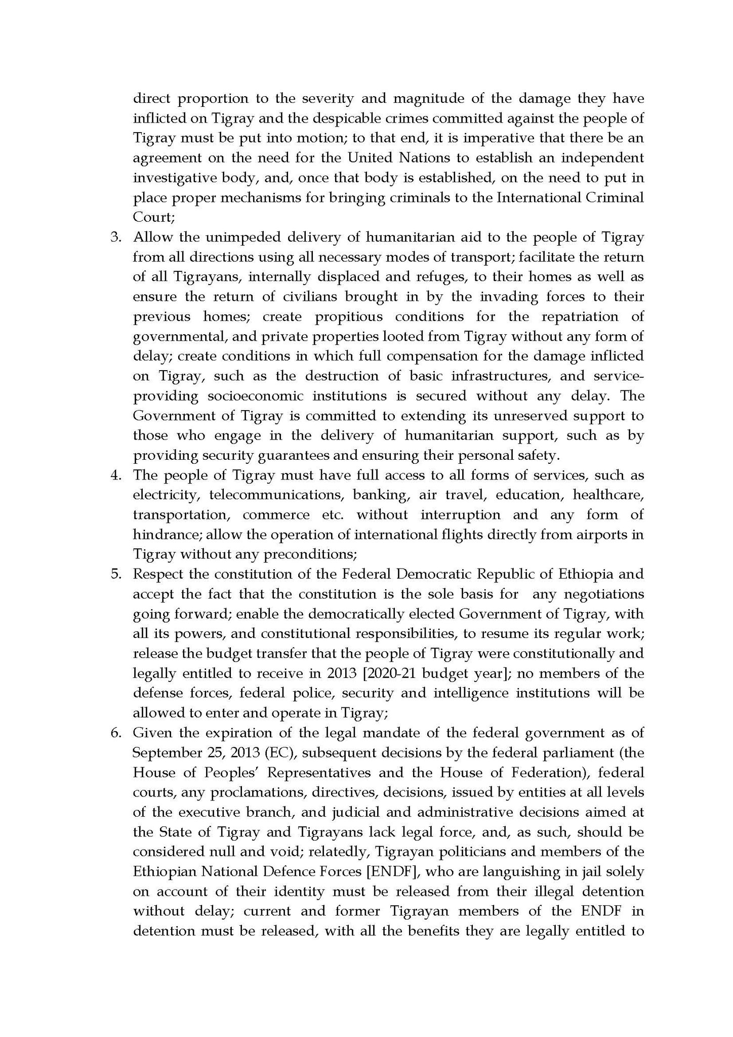 1. Invading forces from Amhara and Eritrea must withdraw from Tigray and return to their pre-war territories; members of the Eritrean security, intelligence and defense establishment currently in Ethiopia must leave the country immediately and without any delay; any contacts, be it domestic or foreign, that bear directly on the national interests of Tigray must go through the legitimate and legal Government of Tigray; the resolution of issues related to Tigray and Eritrea must be predicated on dialogue with the Government of Tigray alone;