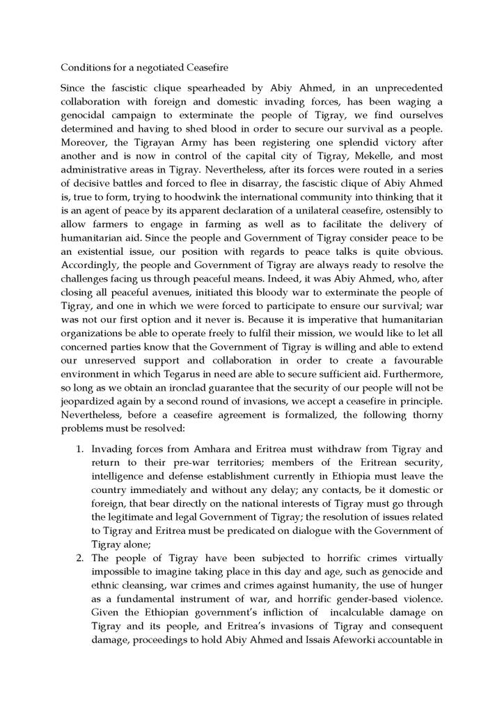 Statement of the Government of #Tigray on conditions for Negotiated Ceasefire (PDF-file)